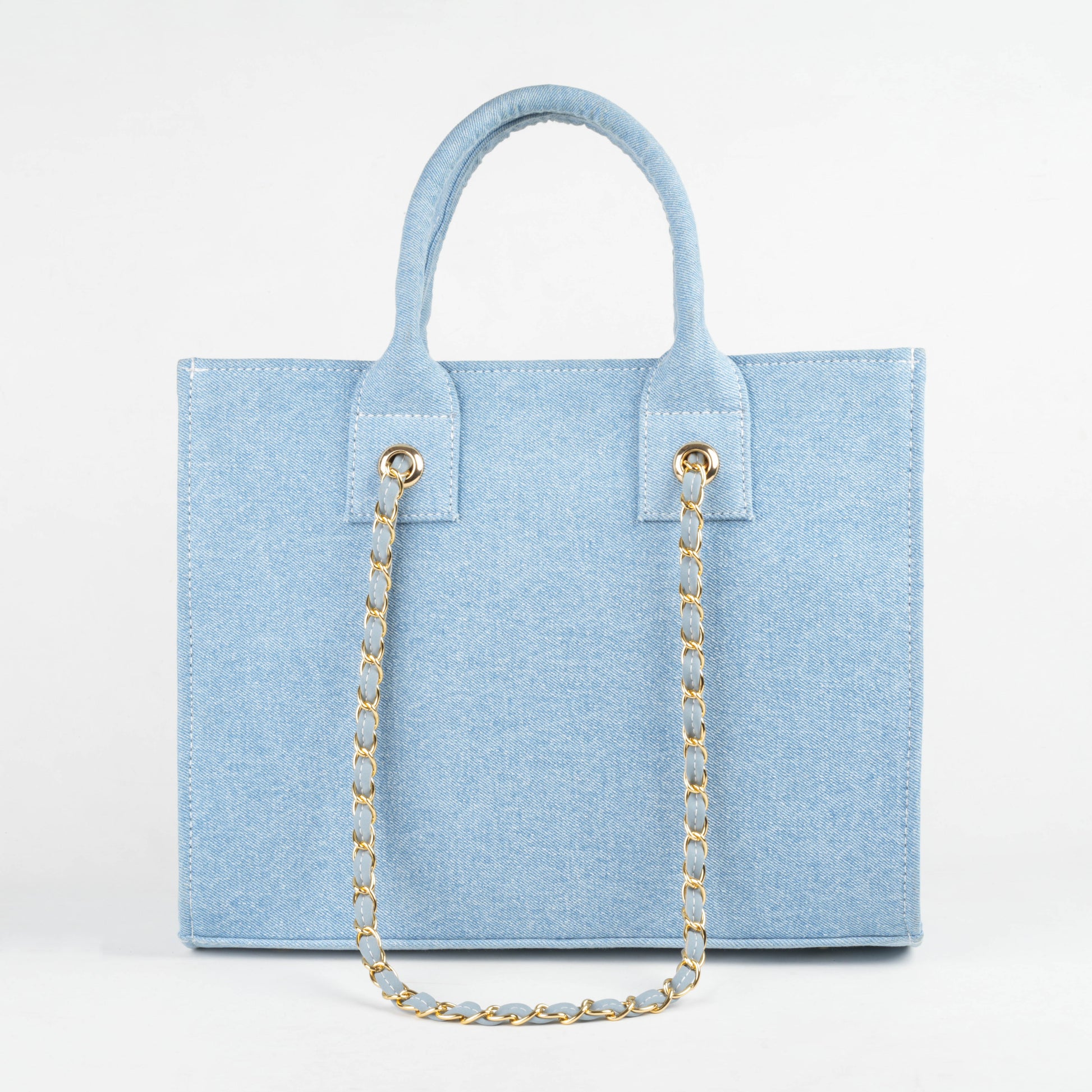 • Gold-accent chain strap with denim weave
